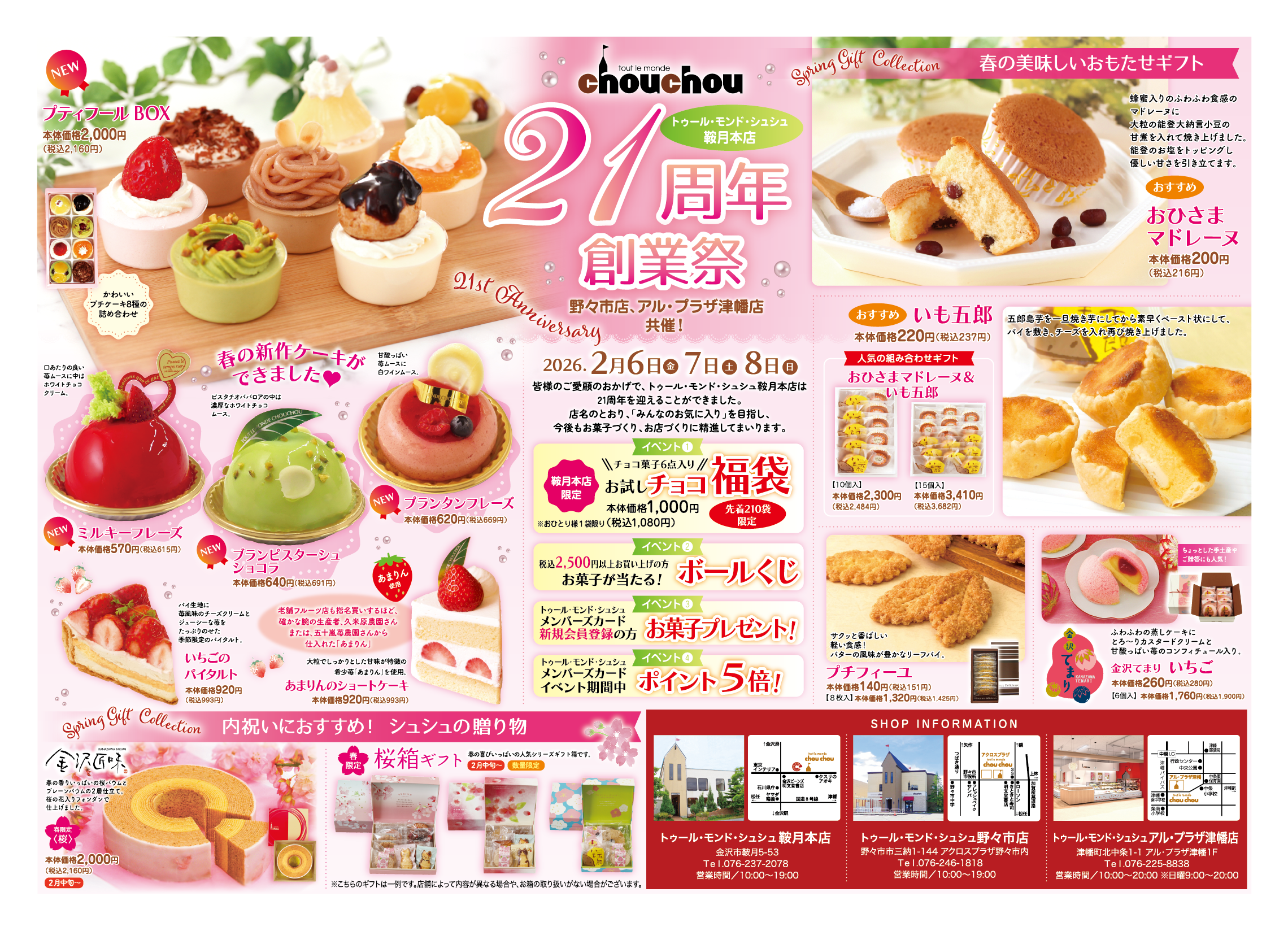 2月6日(金)~2月8日(日)の3日間限定で鞍月本店21周年創業祭を開催します!人気のいちごスイーツやバレンタインにおすすめのショコラスイーツなど、見た目も華やかなスイーツが盛りだくさん!