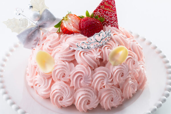 口どけの良いムースフレーズとほんのりバジルが香る爽やかな味わいのライムのムース、甘酸っぱいベリーのクーリーを重ねました。クリスマスにぴったりの華やかなドレスをイメージしたケーキ。